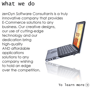 A positive web presence attracts customers. zenDyn can help you establish that presence, ensuring your company's online image is everything it needs to be. Today, every business must take advantage of new technology in order to expand. Any business, small or large can benefit from the advantages provided by zenDyn eBusiness solutions.